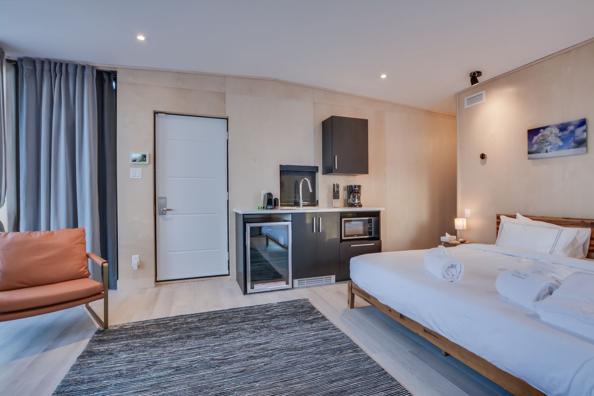 Cette location de Tiny House à Tremblant mesure 425 pc et peut accueillir deux personnes avec un lit King-size et une salle de bain attenante. Il est parfait pour une escapade romantique en week-end.