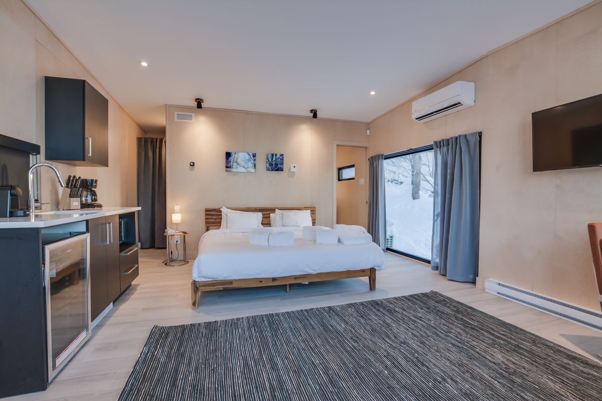 Cette location mini-maison Tremblant a un plan ouvert qui est délimité par un mur entier de fenêtres allant du sol au plafond. Au milieu de la chambre se trouve un lit King-size avec une vue directe sur le justify environnant.