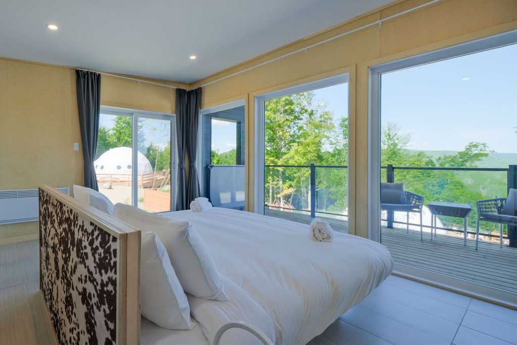 La chambre a un lit king-size face aux grandes fenestrations afin que vous puissiez profiter de la vue sur la nature. La chambre dispose d’un grand placard, d’une douche et d’un lavabo.