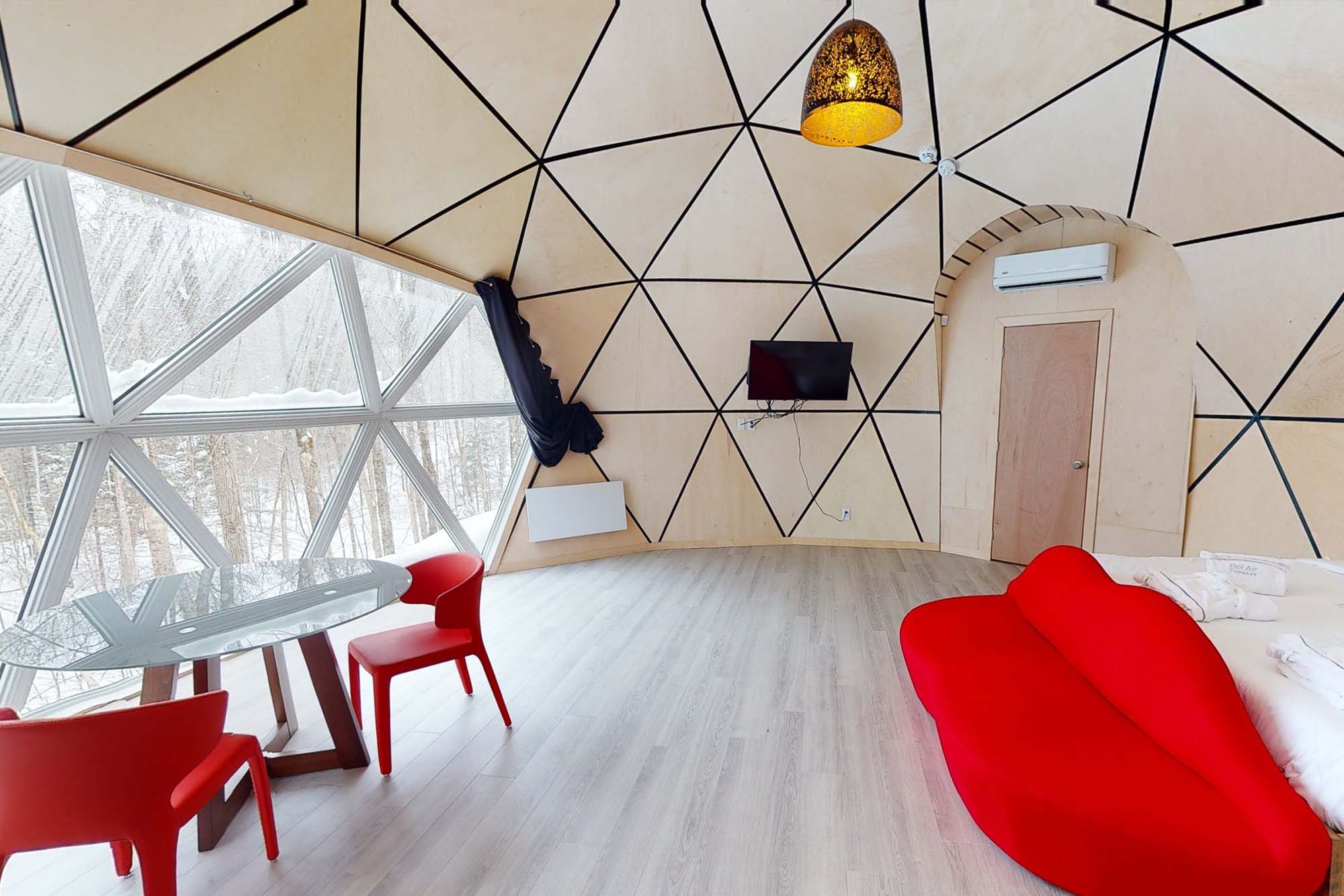 The Mickey dome rental in Mont Tremblant offers 1 king-size bed, 1 bathroom and sleeps 2 people. This one-of-a-kind dome rental is located at Bel Air Tremblant Resort. It is within walking distance to Ekki Sushi, the #1 Japanese restaurant in Tremblant. It is just 8 minutes from the ski resort.