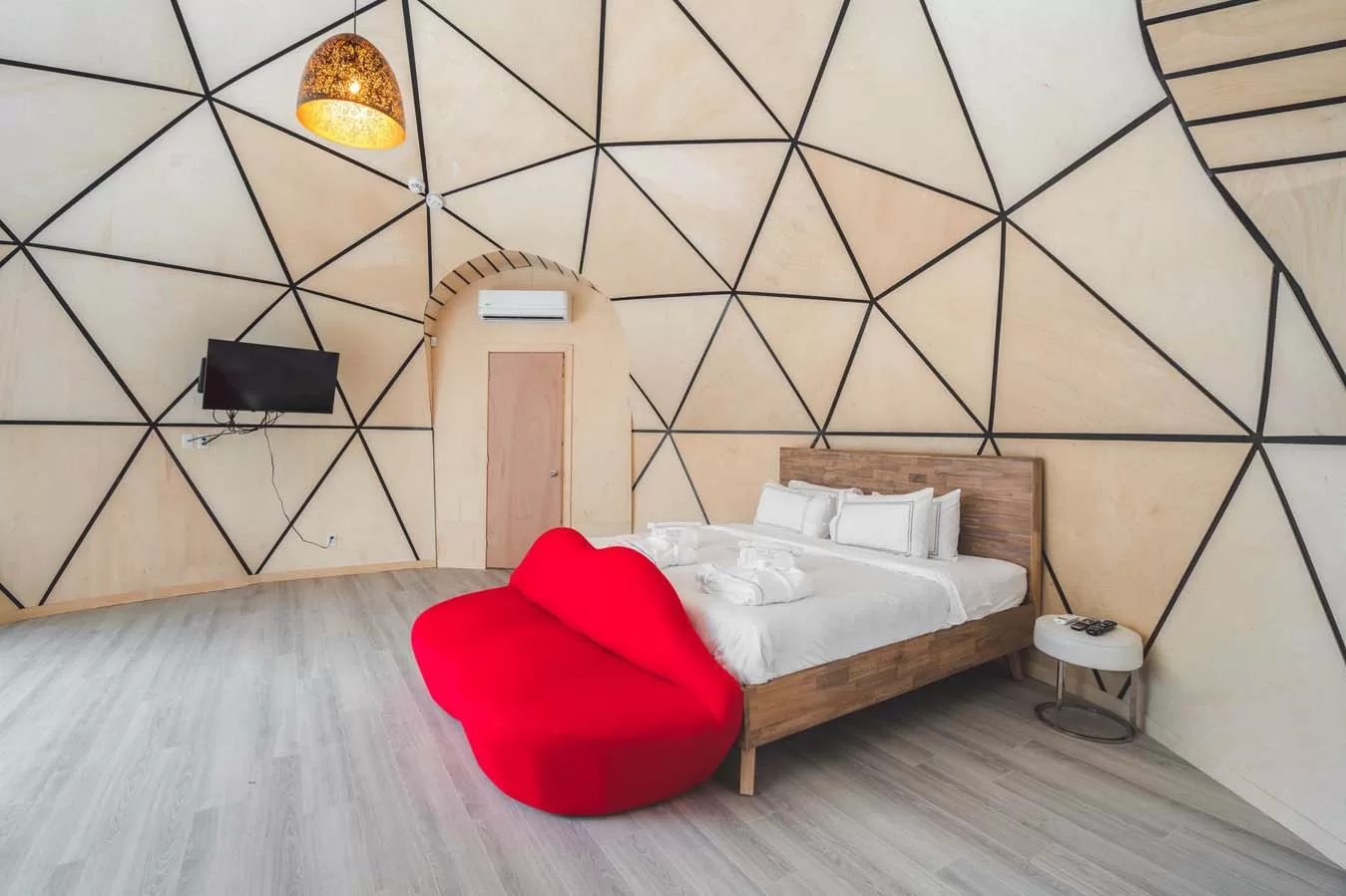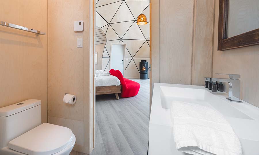 The Mickey dome is one big open living space with a large pane window that fills the room with light. A plush king-size bed sits across from this window and offers remarkable views of the surrounding landscape.
