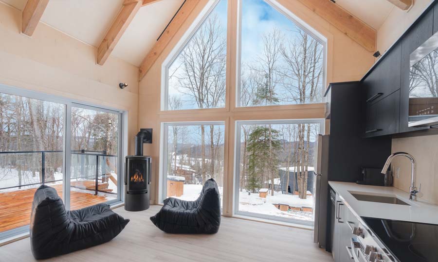 Finally you enter the open living area which combines the kitchen and living room. This room has two walls that each have a floor-to-ceiling pane window that bring in loads of light and amazing views. In the corner is a gas fireplace and two comfy chairs. In the center of the room is a table with chairs for dining, reading a book or playing a game. To the left is the kitchenette which is equipped with a refrigerator, a microwave, stovetop burners, Nespresso machine, cookware, and utensils.