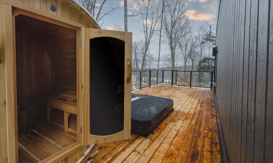 Outside there is a barbecue grill, patio chairs, a hot tub and a sauna.
